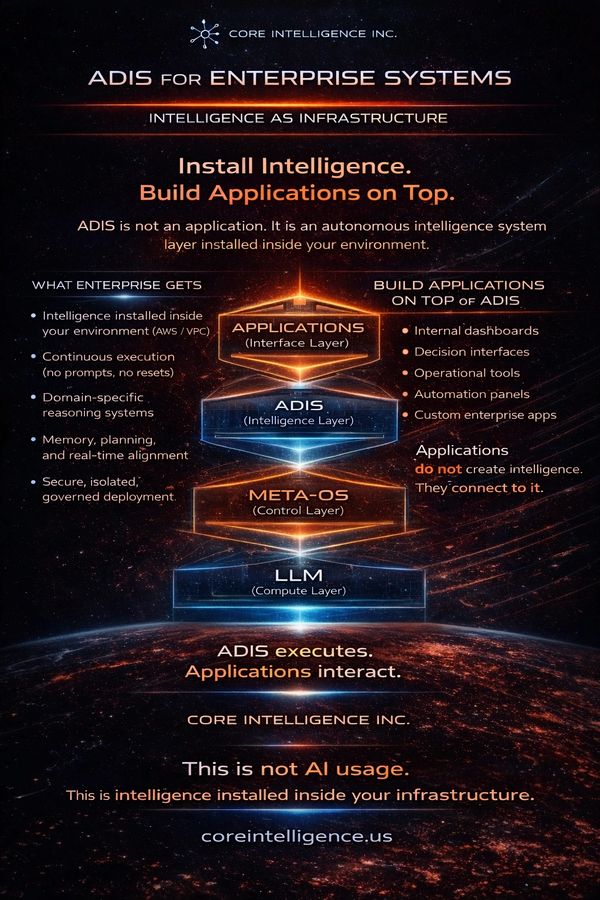 ADIS executes reasoning, memory, planning, and decision logic continuously inside your infrastructure.